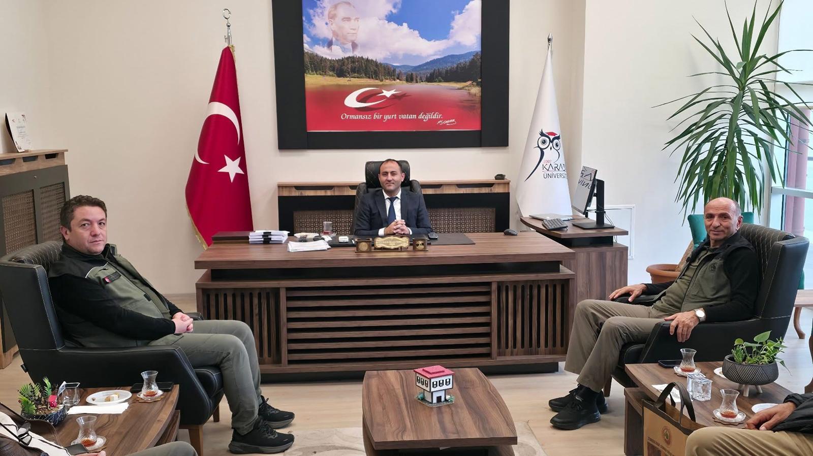 Zonguldak Orman Bölge Müdürü Sayın Hasan KESKİN, Fakültemiz Dekanı Prof. Dr. Hüseyin YÖRÜR’ü makamında ziyaret etti. Görüşmede, 2025-2026 Akademik Yılı Güz döneminde ilk defa öğrenci kabul eden Doğa Koruma ve Biyoçeşitlilik Yönetimi Bölümü, Karabük ilinin doğal kaynakları ve doğa koruma potansiyeli ile son dönemde ülkemizde meydana gelen orman yangınları ele alındı. Öğrencilerimizin mesleki yeterliliklerinin geliştirilmesi sürecinde orman teşkilatı olarak her türlü desteği vermeye hazır olduklarını ifade eden Sayın KESKİN’e nazik ziyaretleri için teşekkür ederiz.