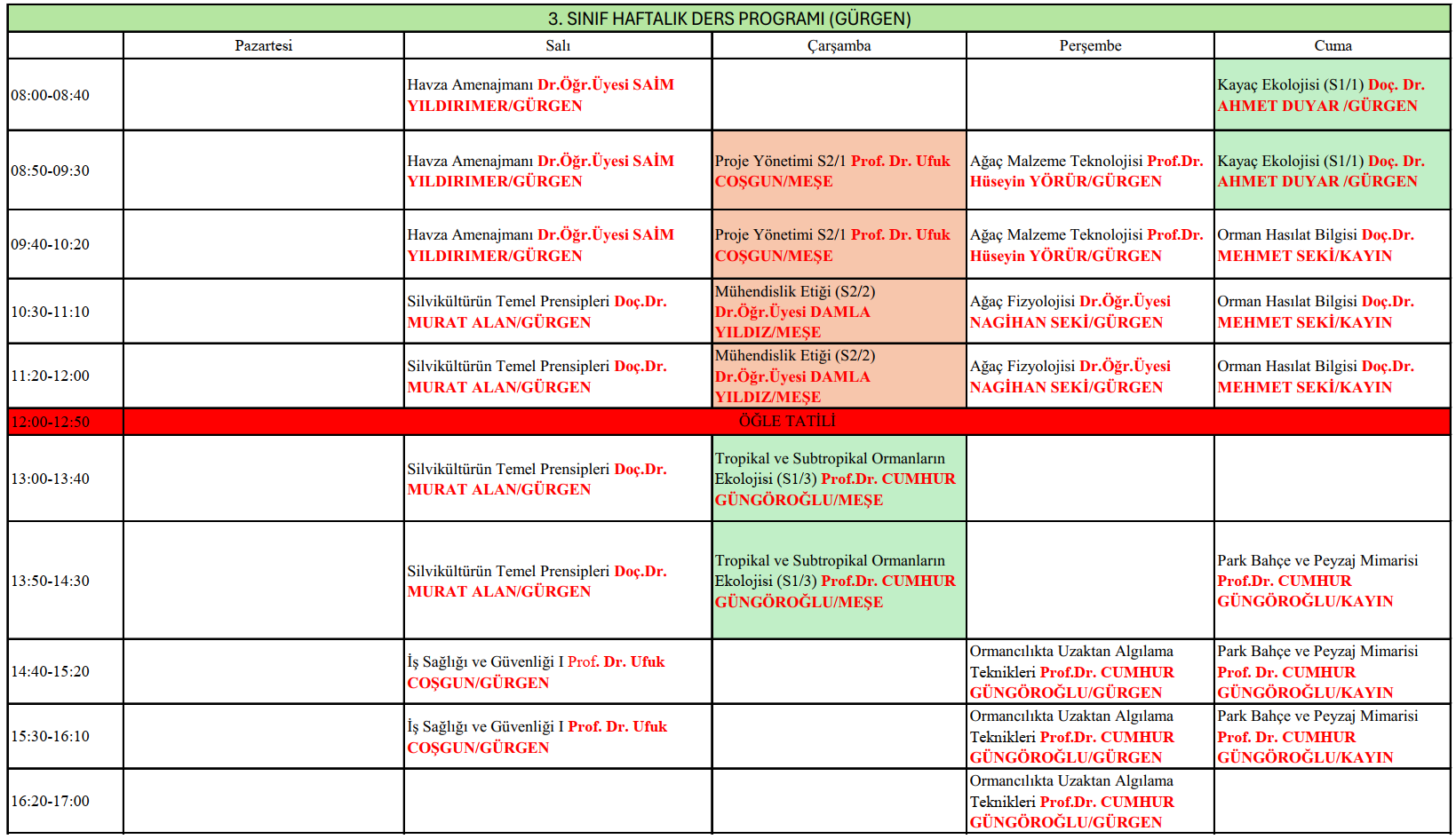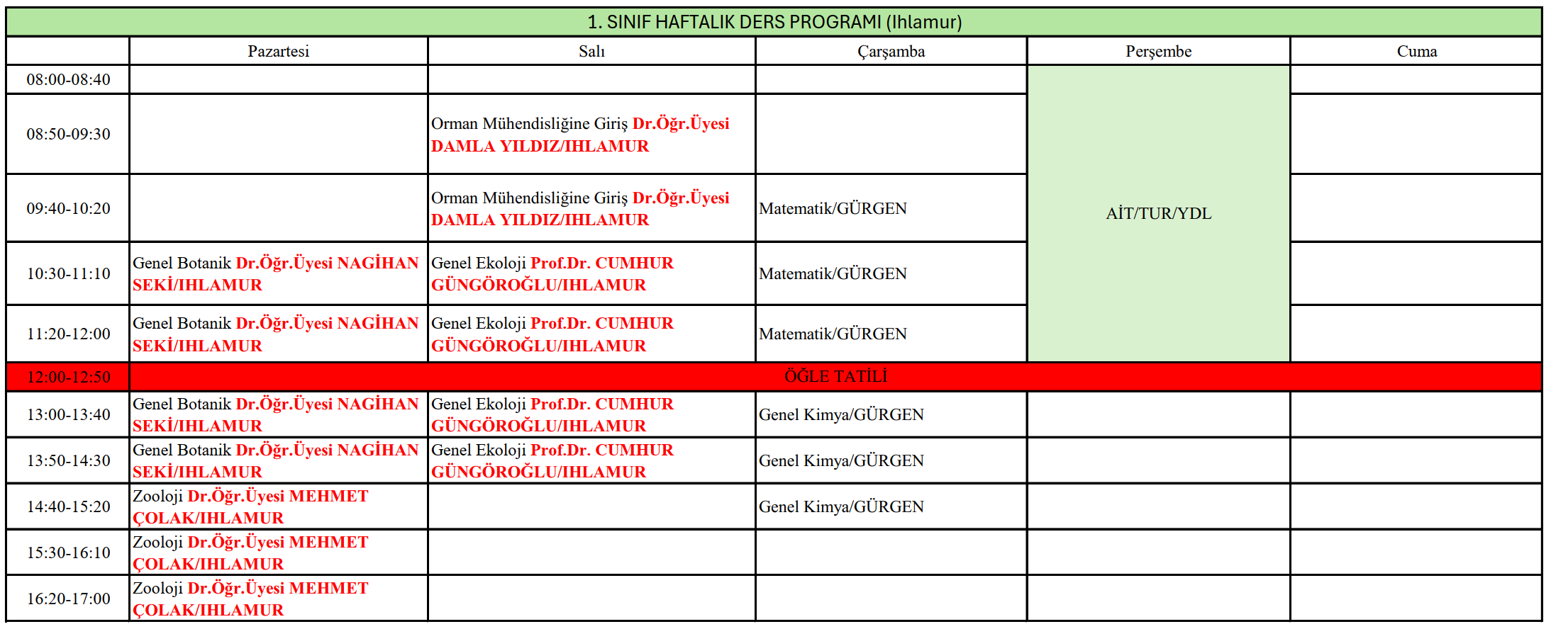 ORMAN MÜHENDİSLİĞİ BÖLÜMÜ 2025/2026 GÜZDÖNEMİ DERS PROGRAMI